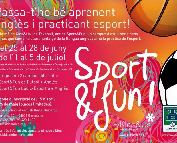 TakeBall y Kids&Us ya ha puesto en marcha el Campus de verano Sport&Fun, dedicado a niños de entre 4 y 16 años, exclusivamente en inglés. En una ubicación ideal en Barcelona, los más jóvenes podrán aprender fútbol y disfrutar de un sinfín de actividades deportivas. Del 25 al 28 de junio y del 1 al 5 de julio los campos de fútbol de césped artificial de la Teixonera, en la zona de Horta, serán el escenario ideal para llevar a cabo sesiones de técnica y táctica, con el inglés como nexo conductor y con monitores titulados.